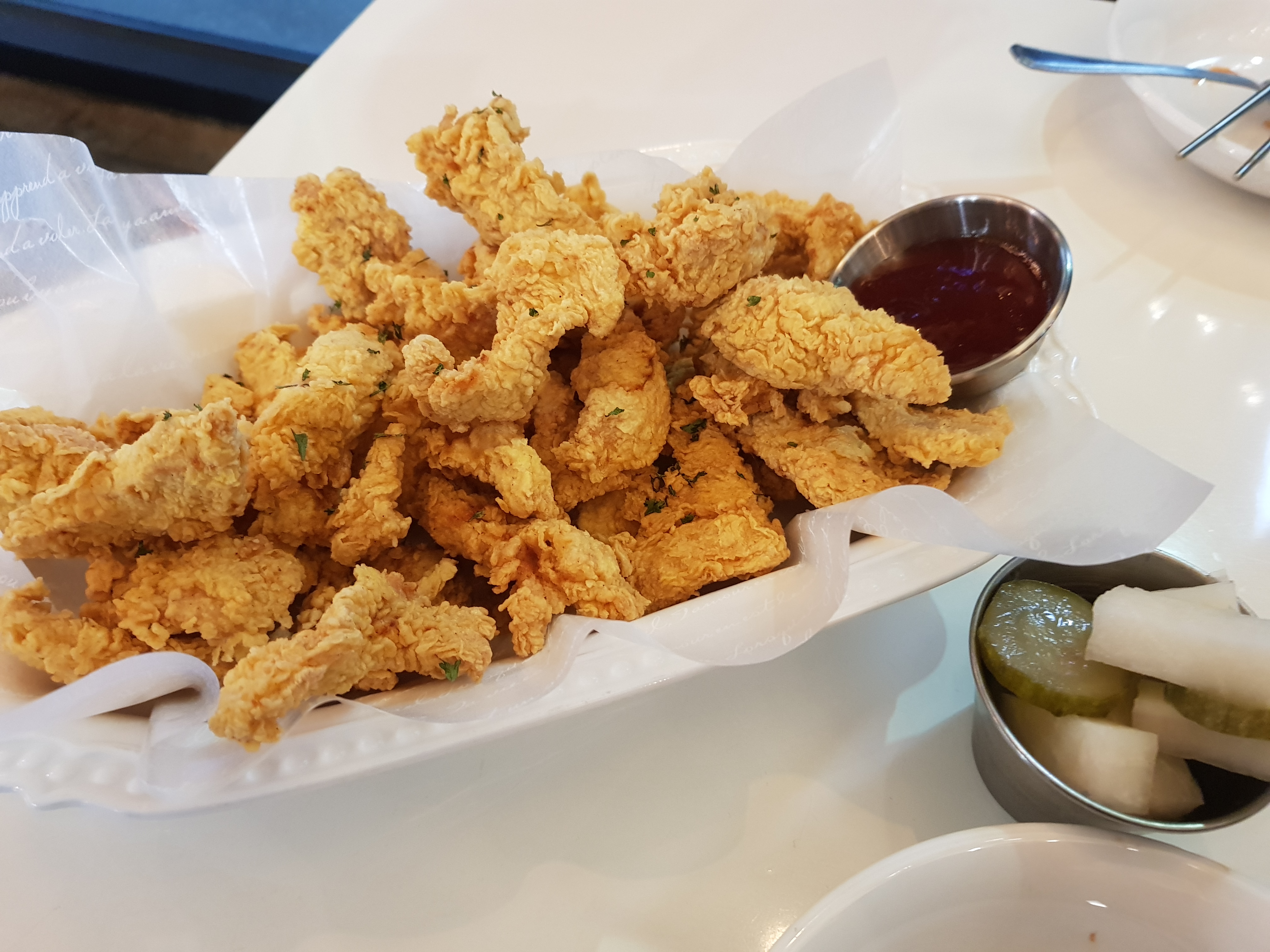 순살치킨을 스파게티 국물에 찍어먹어도 맛있어요.