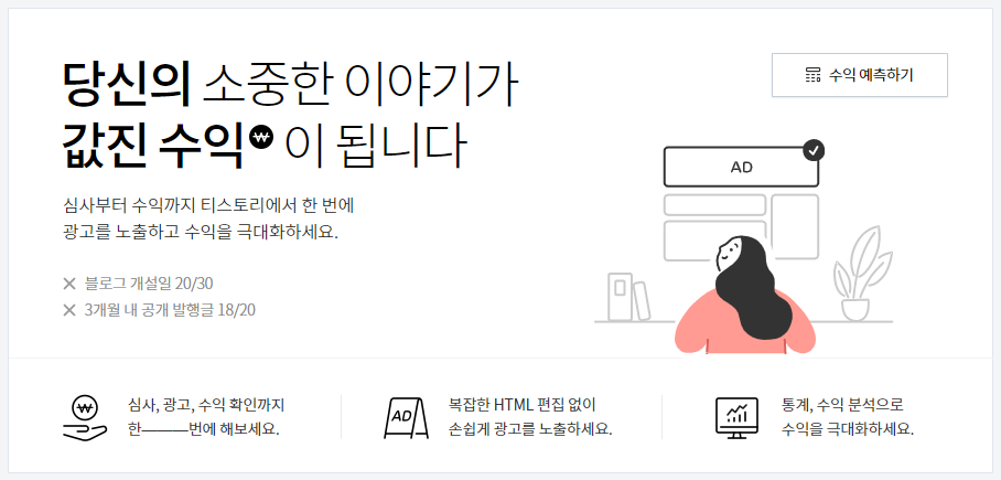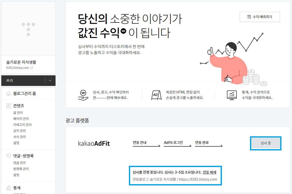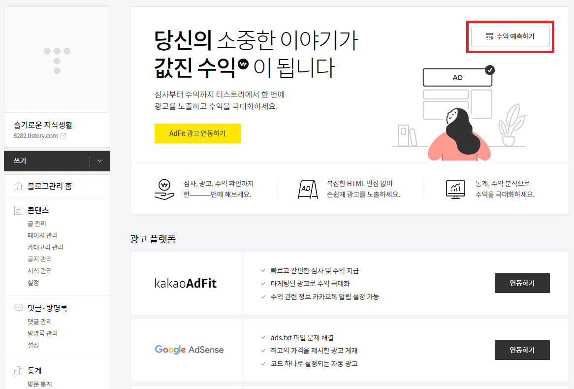 [티스토리 수익] 카카오 애드핏 가입하기_1 티스토리에서 블로그를 운영하시는 분이라면, 블로그 관리를 많이들 들어가실텐데요~ 거기에 이제 수익이라는 카테고리가 생겼답니다~ 어렵지않