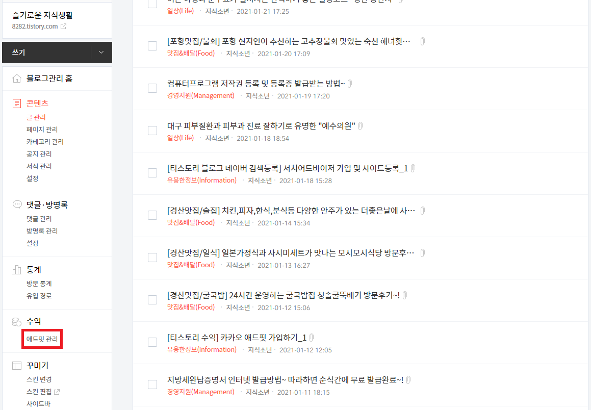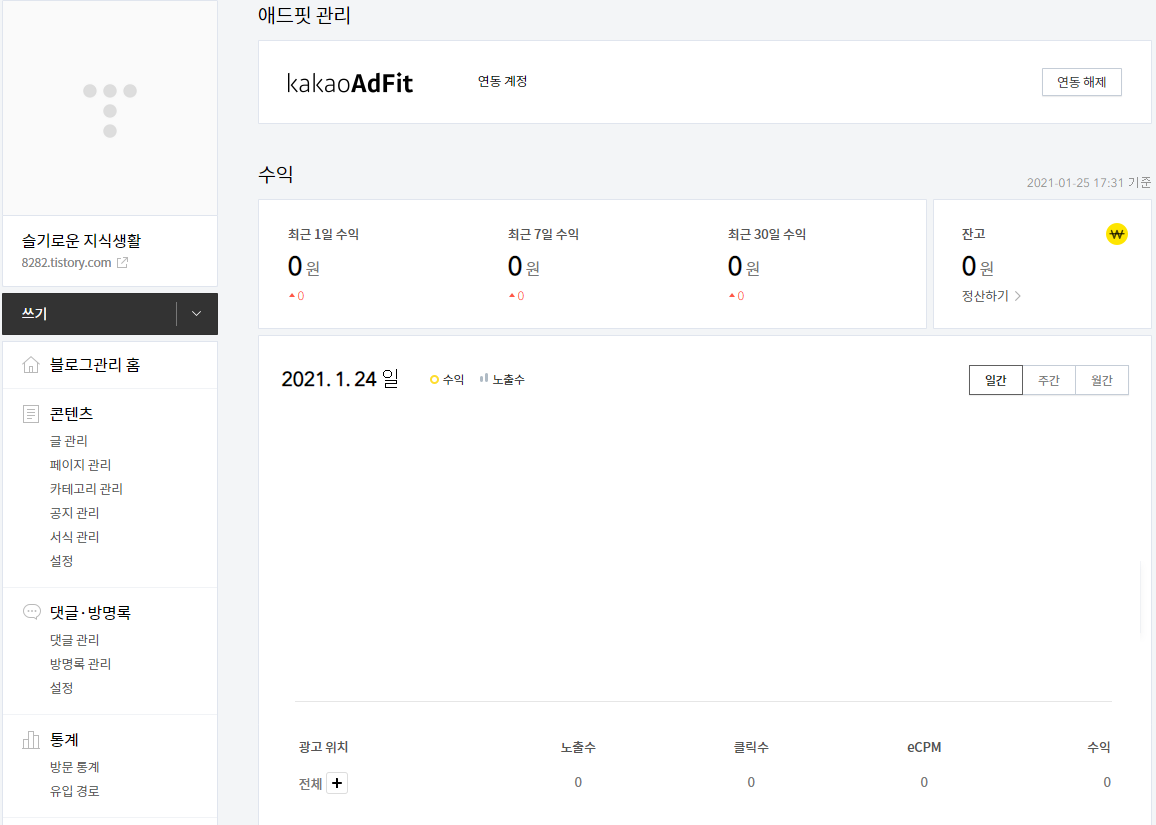 [티스토리 수익] 카카오 애드핏 가입하기_1 티스토리에서 블로그를 운영하시는 분이라면, 블로그 관리를 많이들 들어가실텐데요~ 거기에 이제 수익이라는 카테고리가 생겼답니다~ 어렵지않