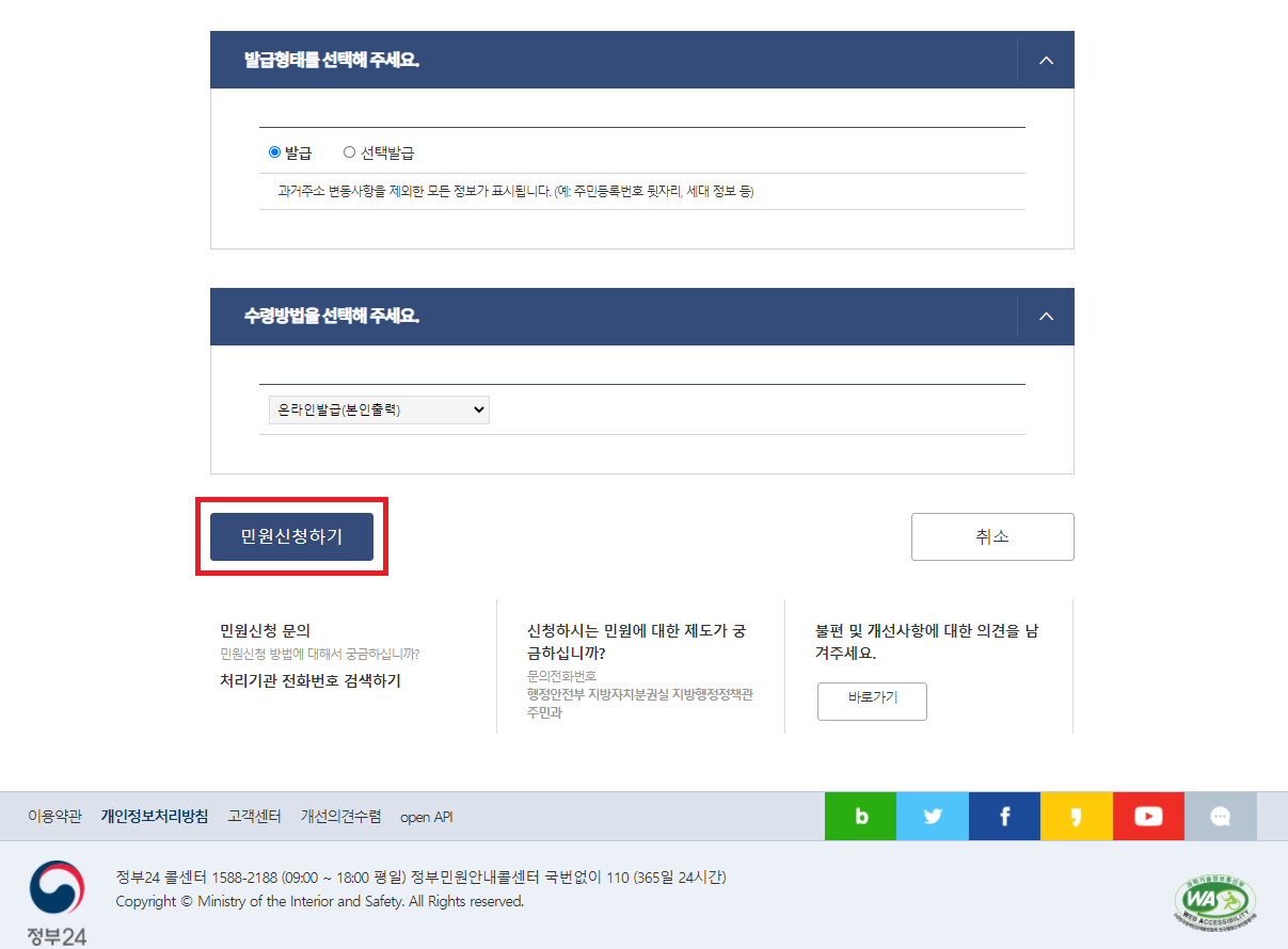 수령방법은 온라인발급(본인출력) 확인하시고,