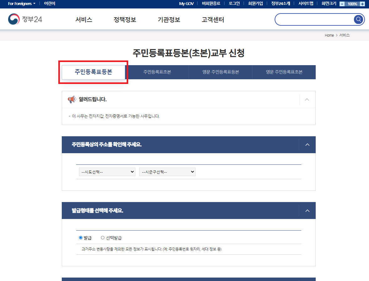 (주민등록초본의 경우, 바로옆에 주민등록표초본을 선택)