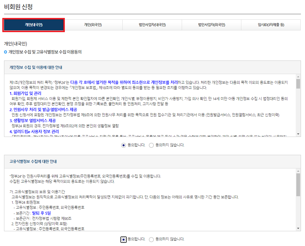 왼쪽위 빨간박스처럼 개인(내국인)을 선택하시고,