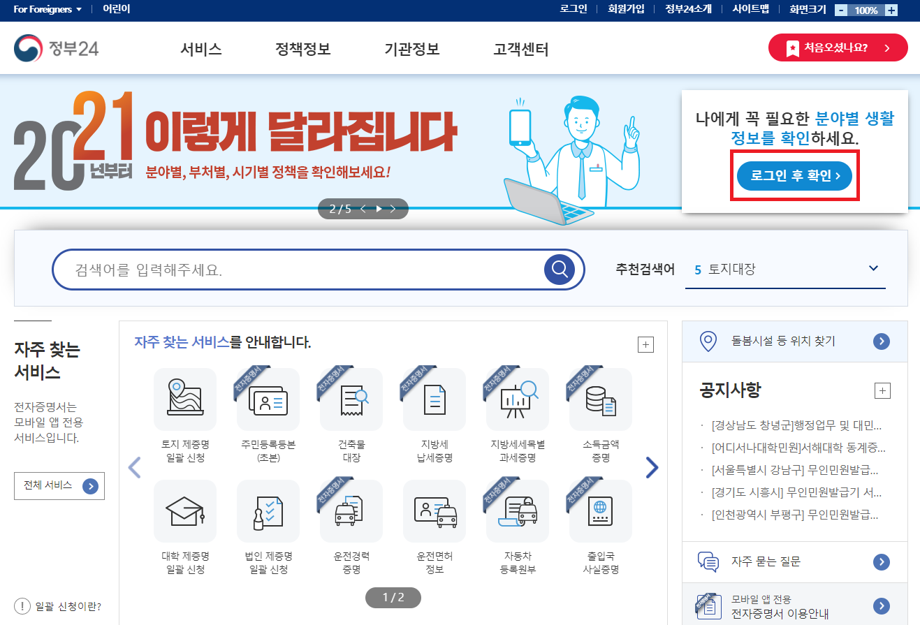 그리고 화면중간에 자주 찾는 서비스 안내에 빨간박스