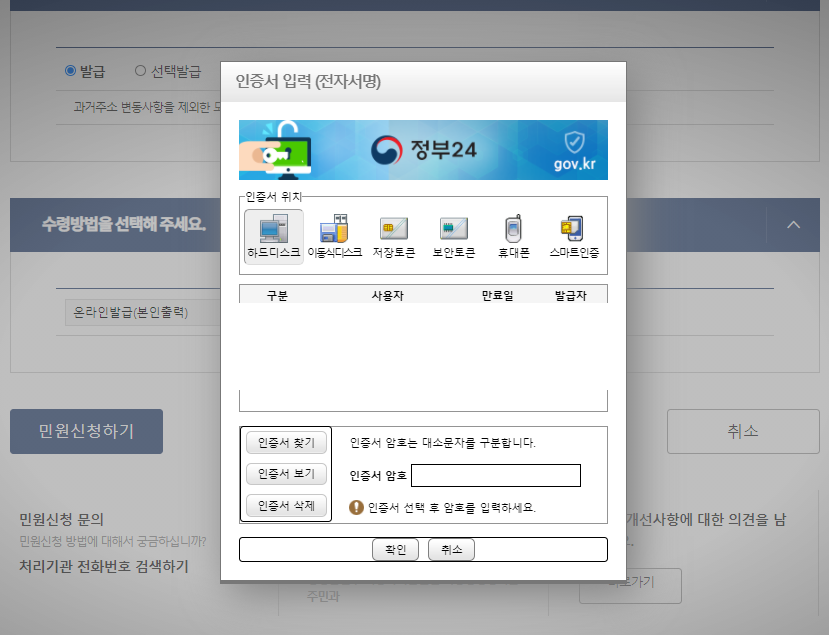 인증서 입력화면이 나와요~
