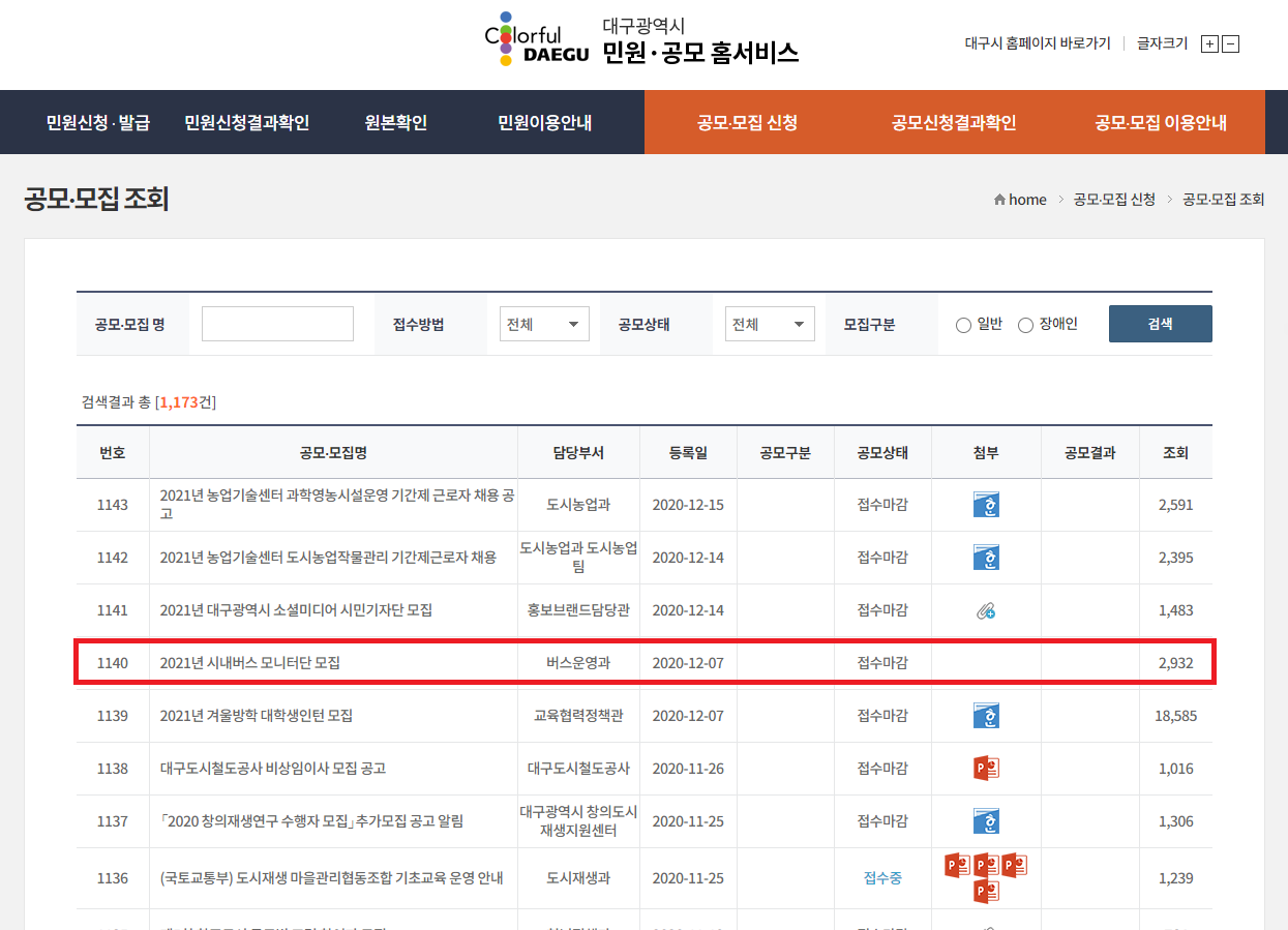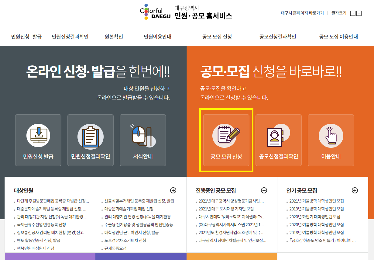 대구광역시 민원 공모 홈서비스 홈페이지 (아래링크 클릭)