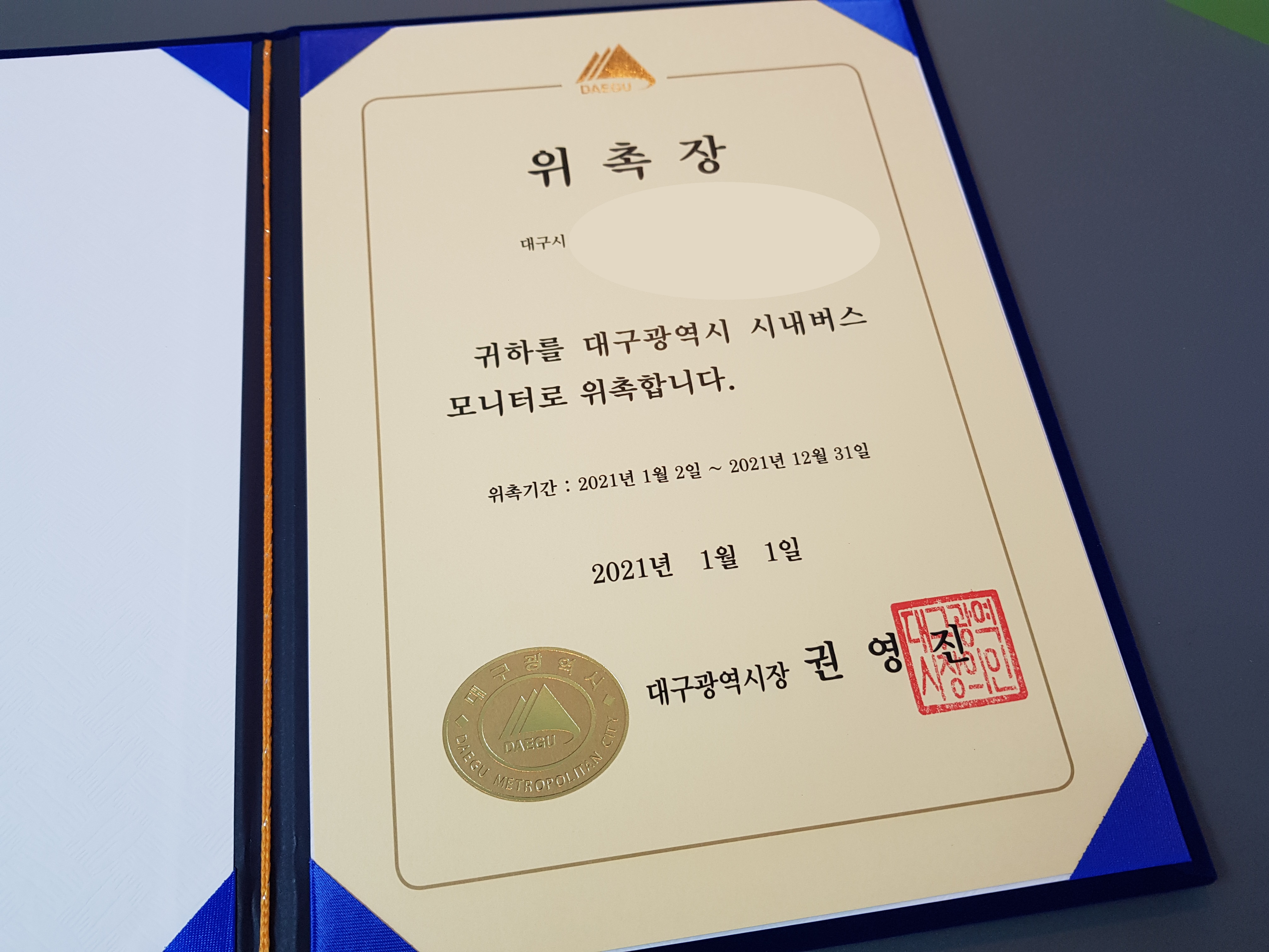 짜잔! 대구시 "시내버스 모니터위촉장" 재중이라고 스티커가 붙어있구요~