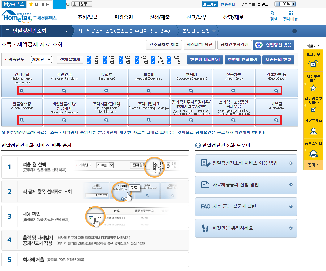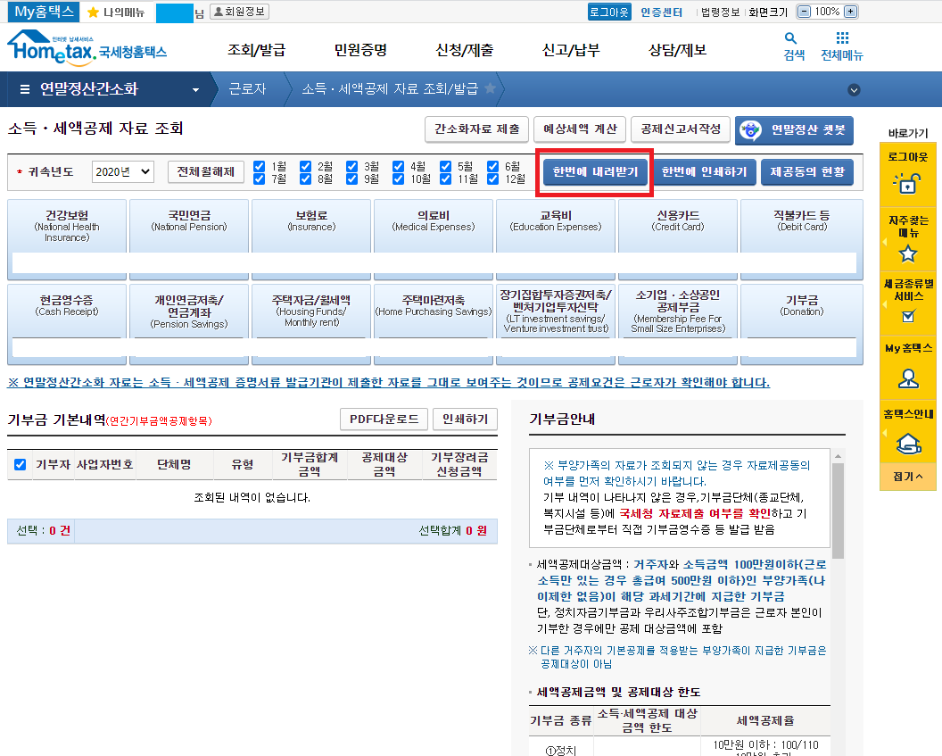 아까 소득/세액공제 자료 조회화면에서