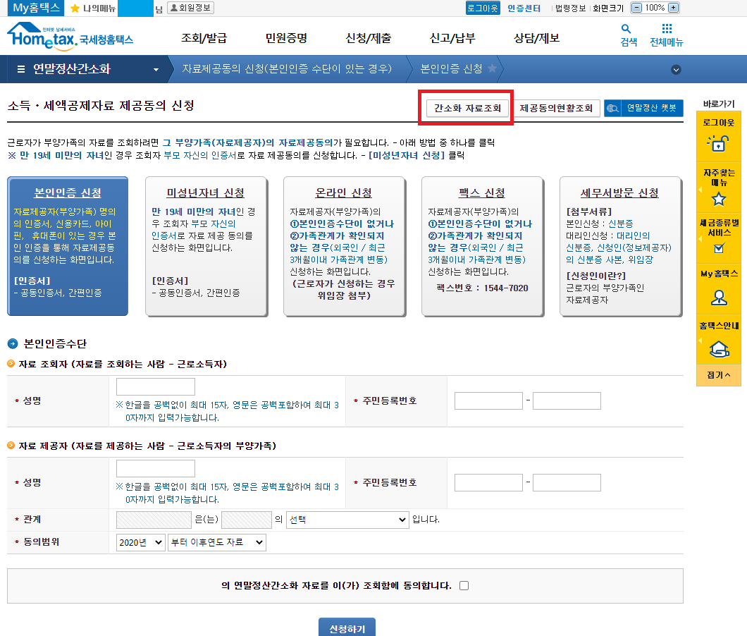 소득/세액공제자료 제공동의 신청화면이 나옵니다~