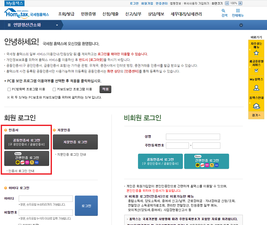 걱정하실필요가 없어요~ 연말정산 메뉴는 비회원도 가능하니까~