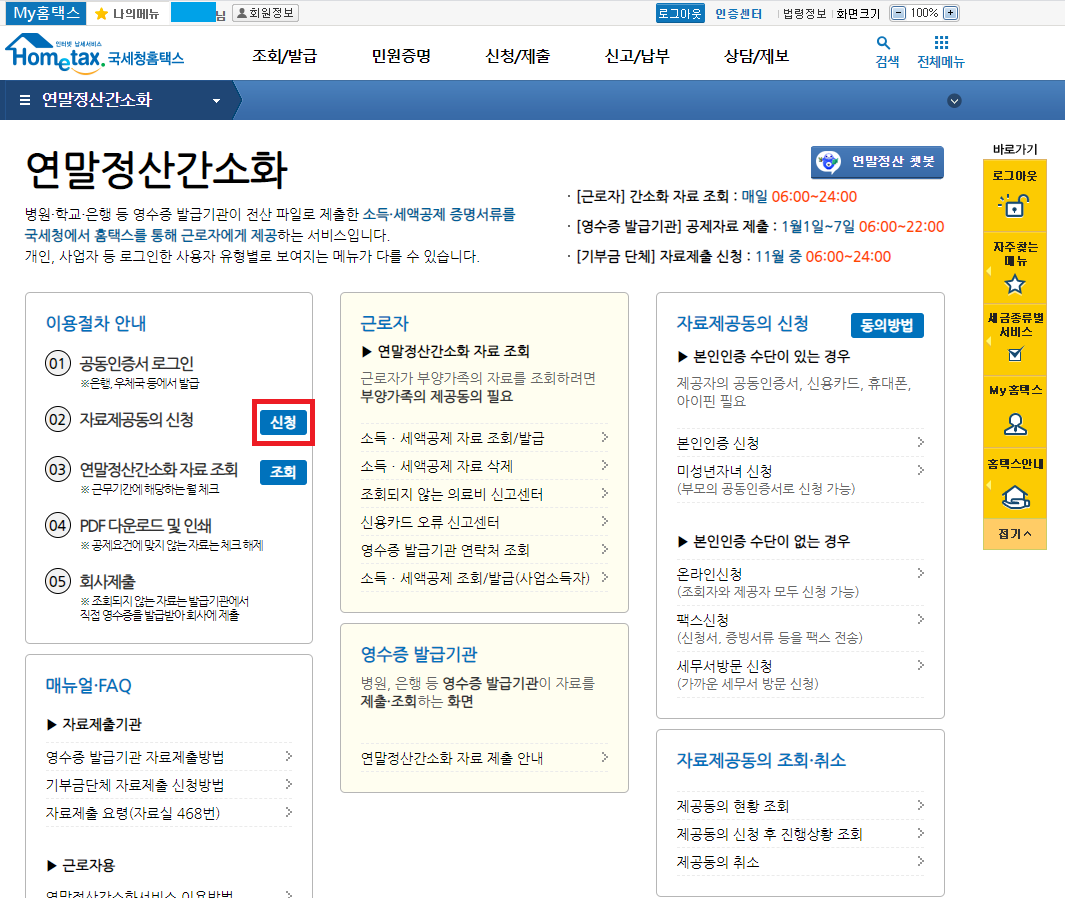 연말정산간소화 서비스 페이지 사이트