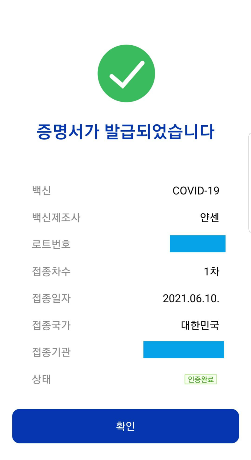 접종일시 및 의료기관을 확인할수 있습니다~