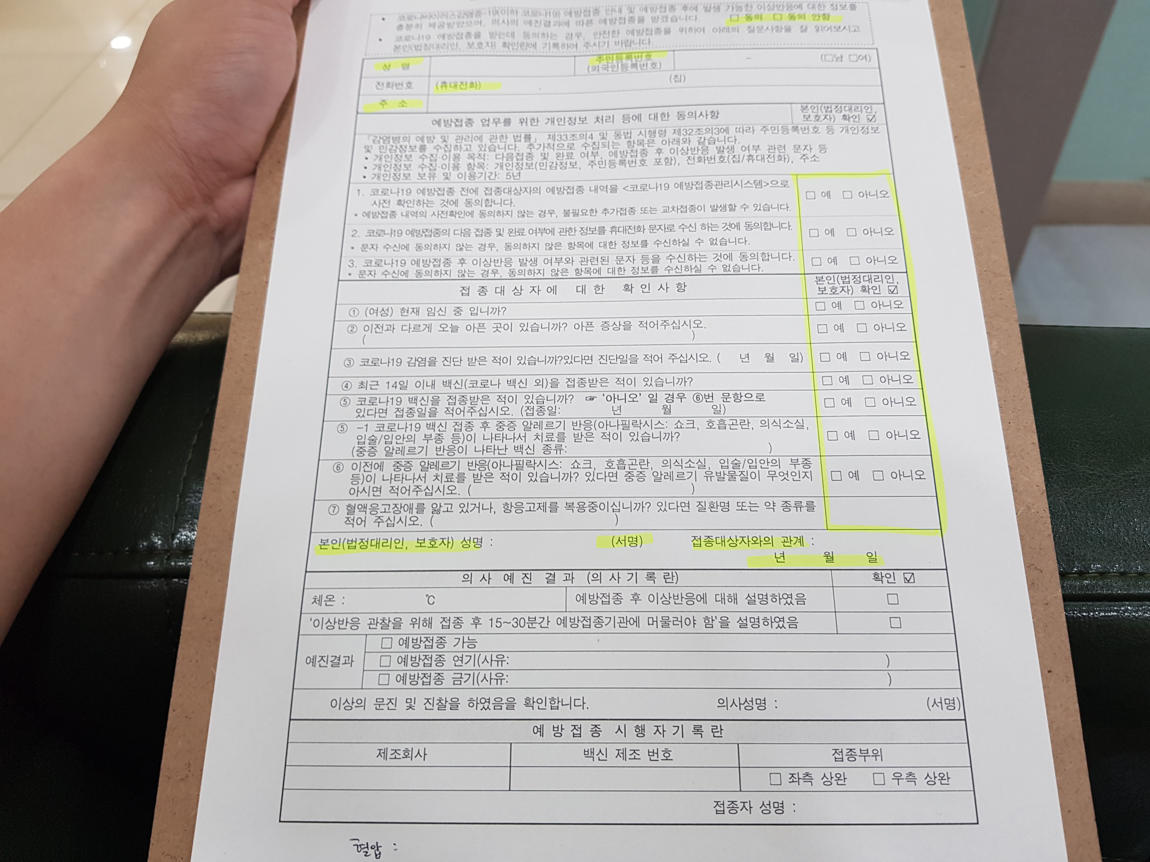 개인정보동의서와 문진표를 받아서 작성하고