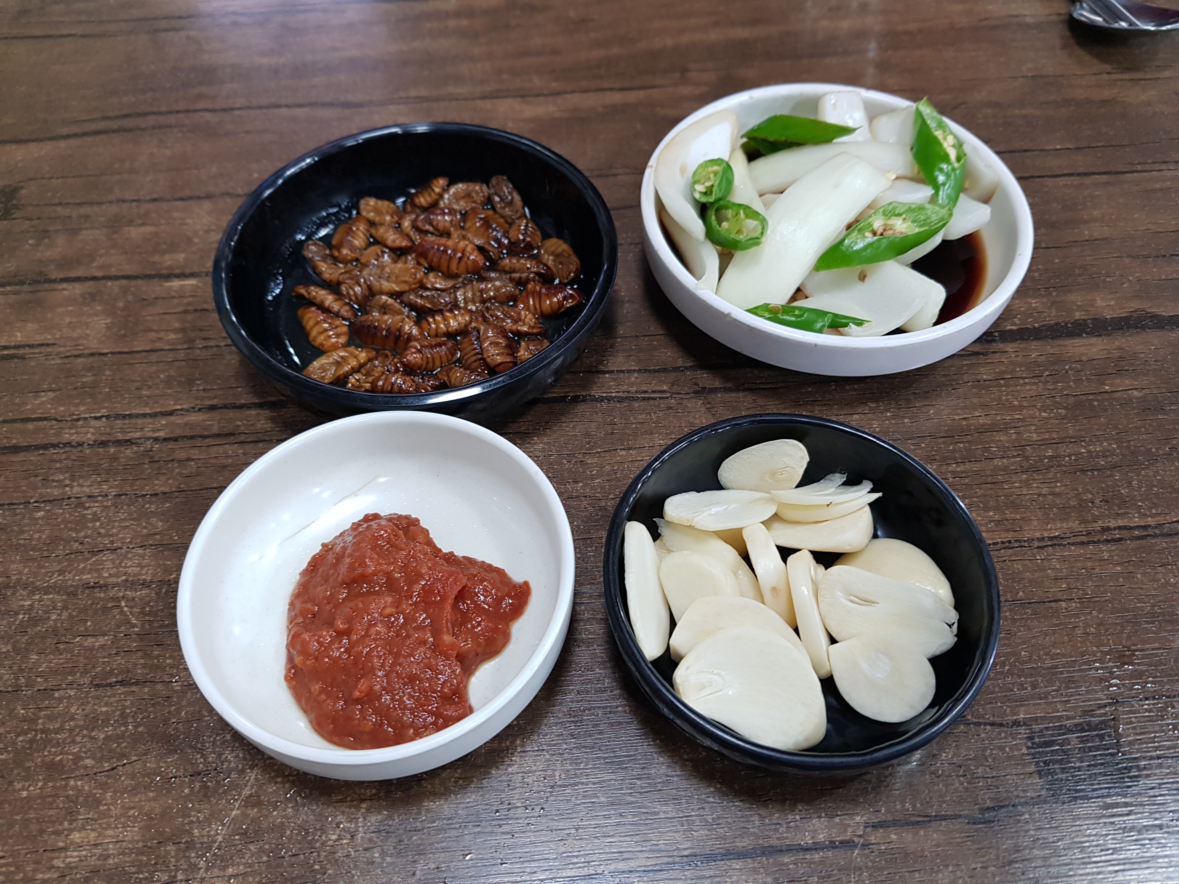양파장, 마늘, 쌈장, 번데기가 나오구요~