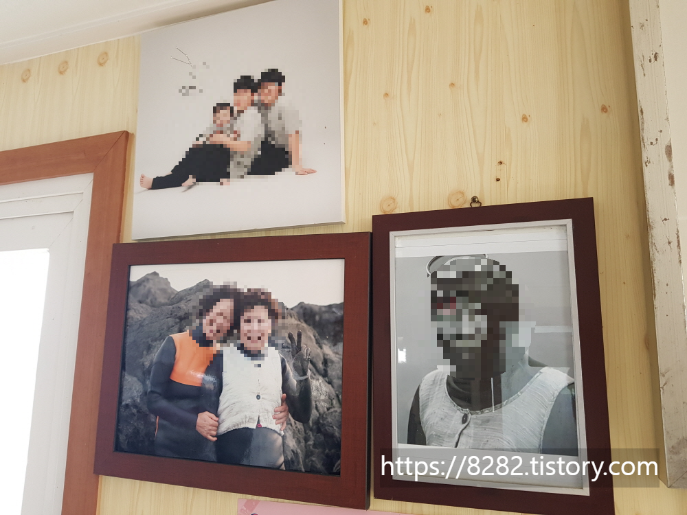 한쪽 벽에 해녀할머니 사장님의 사진이 있어요~